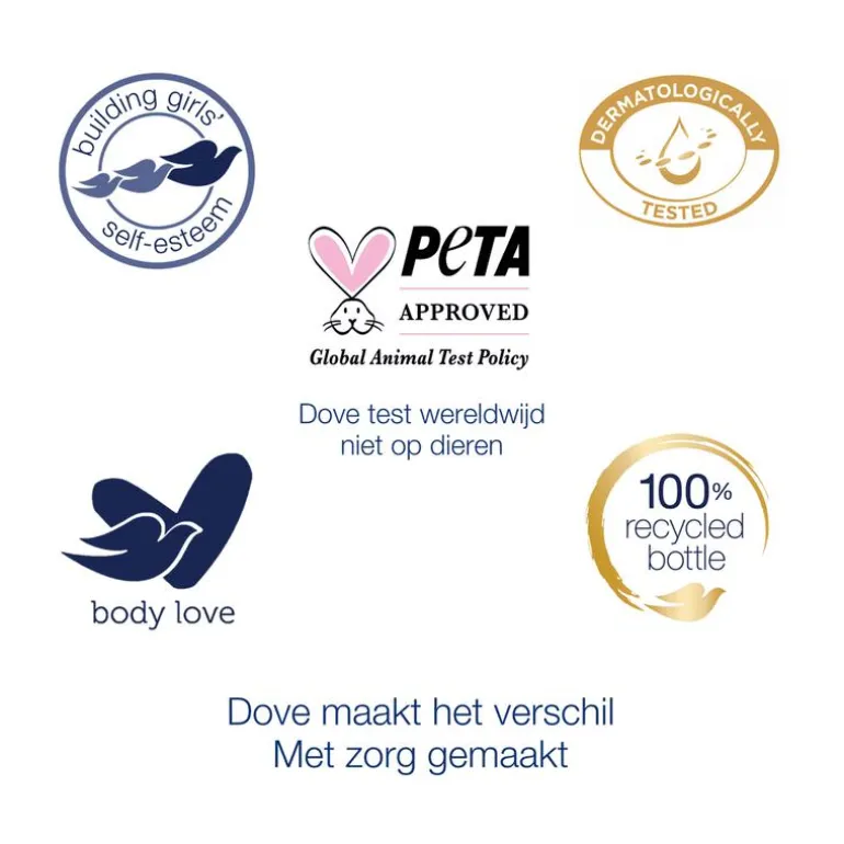 Wanneer het om huidverzorging gaat, willen wij van Dove je producten geven waar je op kunt vertrouwen. Maar de zorg van Dove gaat verder dan alleen onze producten. We willen zorg dragen voor alle vrouwen, we willen schoonheidsnormen opnieuw definiëren en iedereen helpen om schoonheid en lichaamsbeeld op een positieve manier te ervaren. Onze missie is ervoor te zorgen dat de volgende generatie opgroeit met een positief beeld over zichzelf en hun uiterlijk. Via het Dove Self-Esteem Project willen we ervoor zorgen dat er in de wereld waarin deze generatie terechtkomt geen plaats is voor onrealistische schoonheidsidealen. Hoe we onze producten maken en wat erin gebruikt wordt, de impact die we hebben op onze planeet en het streven naar een betere, duurzamere manier van leven is belangrijk voor ons. *Binnen het stratum corneum. **M.u.v. labels en dop.