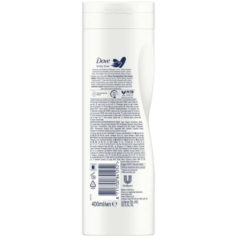 Een bodylotion die de huid niet alleen verwent, maar ook verzorgt. Dove Purely Pampering Bodylotion bevat het Deep Care Complex™, een unieke combinatie van huideigen nutriënten en essentiële olie die de huid diep voedt. In combinatie met de hydraterende ingrediënten zorgt dit voor een optimale verzorging. Het resultaat: een zachtere, mooiere en gladdere huid! De rijke lotion met sheaboter helpt de huid te herstellen en diep te voeden. De boter is een perfecte moisturizer voor de huid en beschikt over allerlei vitaminen en mineralen. Naast sheaboter bevat Dove Purely Pampering bodylotion ook de warme geur van vanille. Laat je omhullen door de zachte geur, voel jezelf weer in balans en kom tot rust na een zware, lange dag. Jezelf verzorgen heeft nog nooit zo goed gevoeld (en je huid nog nooit zo zacht). Dove Purely Pampering bodylotion is dermatologisch getest en is geschikt voor alle huidtypen. Dus ook de meest gevoelige huid kan worden verwend. Dove Purely Pampering Sheabutter & Vanille bodylotion kan na een warme douche ideaal worden gebruikt om de huid nog een extra boost te geven en om jezelf nog extra te verwennen. Zo voel jij je weer ultiem vrouwelijk en kan je er weer even tegenaan.