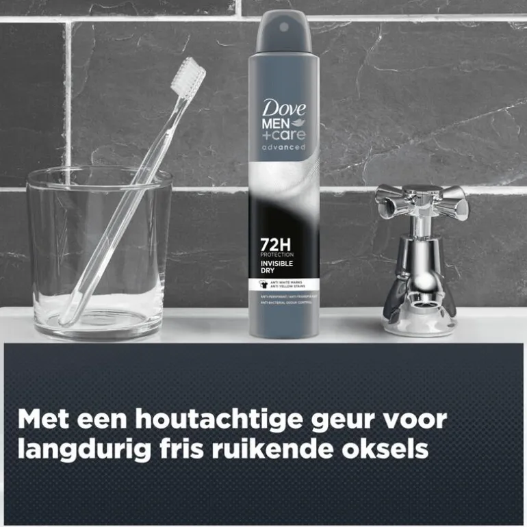 Dove Men+Care Advanced Invisible Dry Anti-Transpirant Deodorant Spray met antibacteriële geurbestrijding biedt tot 72 uur lang krachtige bescherming tegen zweet en beschermt je kleding.