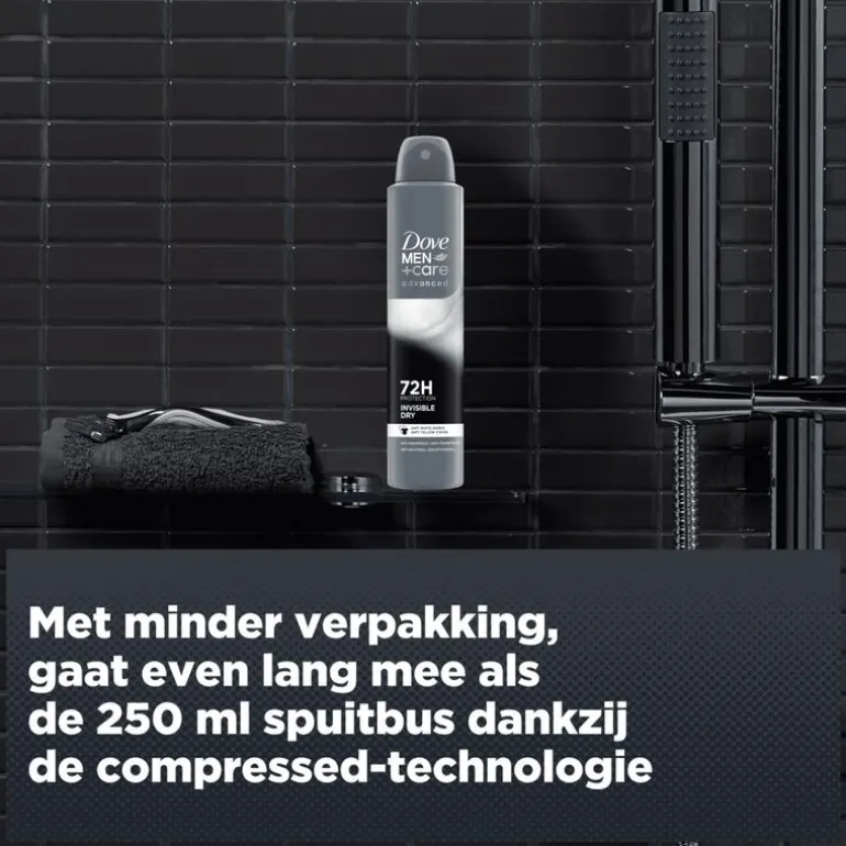 Dove Men+Care Advanced Invisible Dry Anti-Transpirant Deodorant Spray beschermt tot wel 72 uur tegen zweet en verzorgt je huid. De verbeterde formule met antibacteriële geurbestrijding voorkomt nare geurtjes. De 1/4 vochtinbrengende crème beschermt je okselhuid tegen irritatie door zweet en scheren. Deze anti-transpirant beschermt je kleding bovendien tegen gele vlekken en witte strepen. Het dragen van je favoriete kleding geeft je het zelfvertrouwen om elke dag aan te gaan. Dove Men+Care Advanced Invisible Dry Anti-Transpirant Deodorant Spray helpt je er op je best uit te zien en je op je best te voelen. De semicompressed-spuitbus van 200 ml gaat even lang mee als de gewone versie van 250 ml. Bovendien zorgt onze compressed-technologie ervoor dat onze deodorants hun gas langzaam afgeven, waardoor ze ook milder zijn voor de huid.