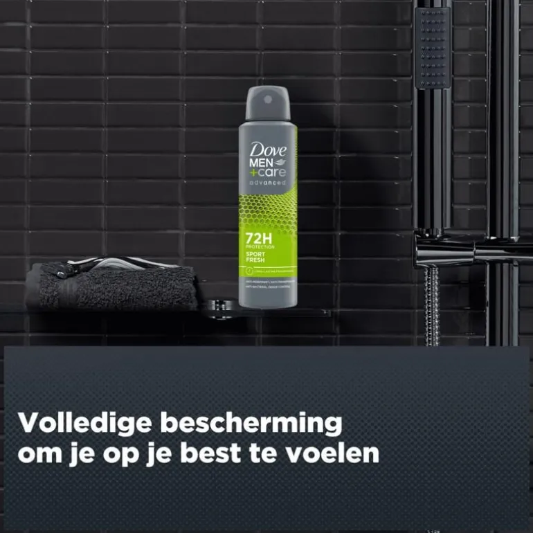 De Dove Men+Care Advanced Sport Fresh Anti-Transpirant Deodorant Spray beschermt 72 uur lang tegen zweet en geurtjes, heeft een langdurig frisse geur en verzorgt je oksels. Het bieden van bescherming komt op de eerste plaats bij deze anti-transpirant spray. Gemaakt met de revolutionaire Triple Action Technologie, is deze anti-transpirant ontworpen om je tot 72 uur lang tegen zweet en geur te beschermen. Met een energieke, pittige geur om je langdurig fris en zelfverzekerd te voelen. Deze Dove Men+Care anti-transpirant is verrijkt met onze unieke ¼ hydraterende crème, die je okselhuid verzorgt. Irritaties door zweet en scheren behoren tot het verleden. Je krijgt een gehydrateerde en beschermde huid en gladde, comfortabel aanvoelende oksels. Bescherming tegen zweet en geur: Deze effectieve anti-transpirant zorgt ervoor dat je je de hele dag beschermd voelt, zelfs op de heetste dagen. De anti-transpirant voor mannen is geformuleerd met de revolutionaire Triple Action Technologie om je tot wel 72 uur tegen zweet en geur te beschermen. Langdurige frisheid: Droge oksels geven je de hele dag comfort, maar een langdurige geur geeft de hele dag een fris gevoel. Met een frisse geur geeft deze anti-transpirant deodorant je een schoon gevoel vanaf het moment dat je het aanbrengt. Superieure verzorging: Deze anti-transpirant is verrijkt met 1/4 hydraterende crème en hydrateert en voedt de oksels. Je zult voelen dat het vanaf de eerste keer gebruik zorgt voor gladde, comfortabel aanvoelende oksels.