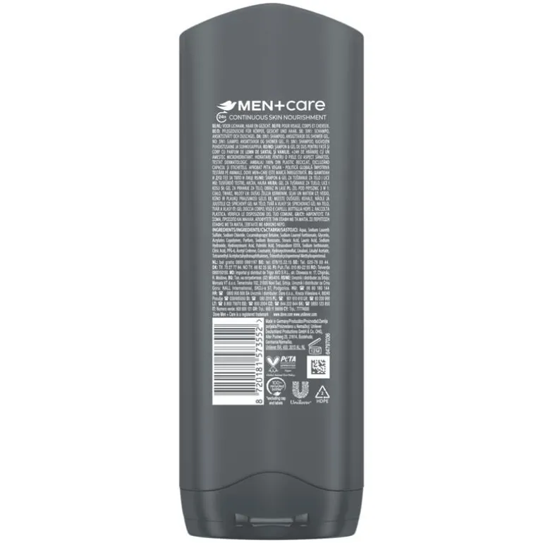 Dove Men+Care Sandalwood + Vanilla 3-in-1 Douchegel is speciaal ontwikkeld voor de huid van mannen en is geschikt voor lichaam, gezicht en haar. De handige 3-in-1 formule zorgt voor extra gemak in gebruik. De douchegel heeft de unieke 24H MicroMoisture technologie voor verzorging en extra hydratatie van de huid. De verbeterde formule met vochtinbrengende bestanddelen heeft 3 keer meer huidversterkende voedingsstoffen die de huid sterker maken bij elke douchebeurt. Hierdoor begin je de dag goed met een huid die gezond, beter beschermd en sterk aanvoelt. Deze 3-in-1 douchegel is dermatologisch getest, heeft een frisse geur van vanille en cederhout en is snel af te spoelen zonder resten achter te laten. Dove Men+Care wil bijdragen aan een betere wereld. Daarom wordt Dove Men+Care 3-in-1 Douchegel verpakt in 100% gerecyclede plastic flessen*. *M.u.v. de dop en labels.