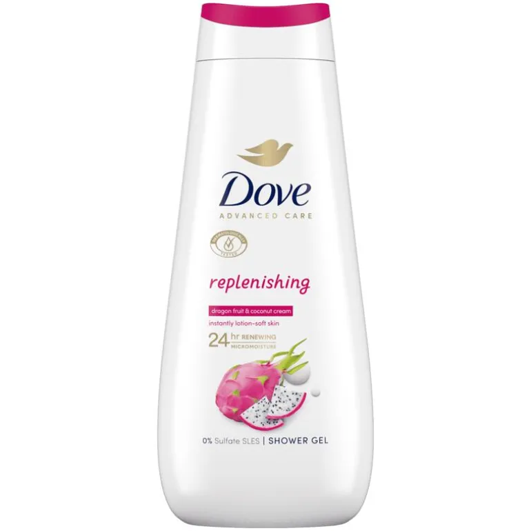 Dove Advanced Care Replenishing Douchegel verandert je dagelijkse douche- of badroutine in een echt verwenmomentje. Dove Replenishing Douchegel heeft een lichte geltextuur en is verrijkt met huidverzorgende voedende bestanddelen. De bodywash reinigt op milde wijze, hydrateert je huid en helpt om haar natuurlijke glans te herstellen met vitaminerijk dragonfruit en voedende kokoscrème. De douchegel bevat de 24-uur vernieuwende MicroMoisture-formule voor een 24 uur lang gehydrateerde, zijdezachte huid. Deze voedende douchegel is gemaakt met natuurlijke milde reinigers en plantaardige moisturisers en is zacht voor het microbioom. De douchegel bevat geen sulfaatreinigers, is voor 94% biologisch afbreekbaar* en is verpakt in 100% gerecyclede plastic flessen**. Dove Replenishing Douchegel heeft een veganistische formule en is door PETA gecertificeerd als ‘vegan’. *94% van de ingrediënten breekt af in kooldioxide, water en mineralen (OESO-testmethoden 301, 302, 310). **M.u.v. de dop en labels.