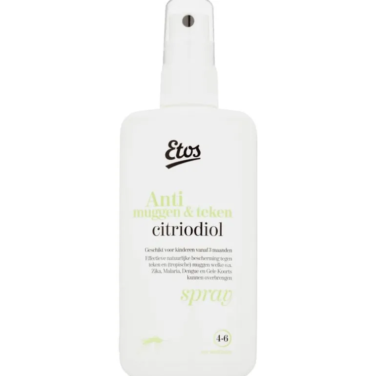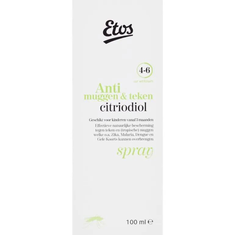 Etos Anti muggen & teken citriodiol® spray is op basis van plantaardige ingrediënten en beschermt de gebruiker 4 tot 6 uur tegen teken, knutten, huismuggen en tropische muggen welke o.a. Zika, Malaria, Dengue en Gele Koorts kunnen overbrengen