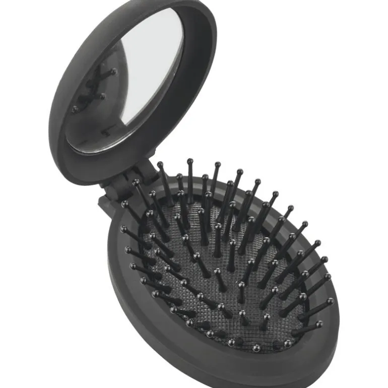 Etos inkapbare haarborstel is ideeal om mee te nemen in je handtas, sporttas of toilettas. Deze kleine, ovale (reis)borstel met handig spiegeltje is zeer geschikt om onderweg je haar te borstelen. In de kleur zwart.