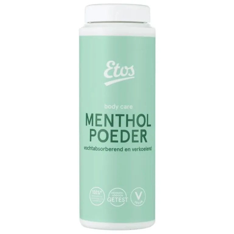 Etos Mentholpoeder is een talkpoeder gecombineerd met menthol. Het poeder werkt vochtabsorberend en verkoelend. Etos Mentholpoeder is prettig in gebruik bij (overmatige) transpiratieproblemen en kan dagelijks gebruikt worden.