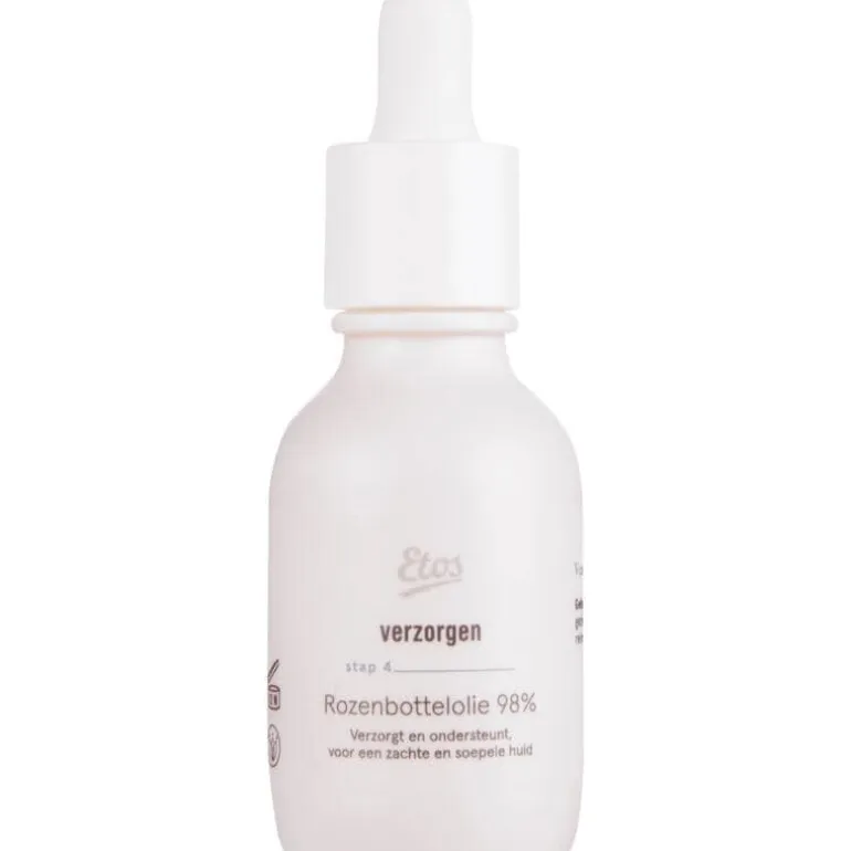 Etos verzorgende gezichtsolie met 98% biologische rozenbottelolie behoudt de huidvochtigheid en ondersteunt de regeneratie van de huid.