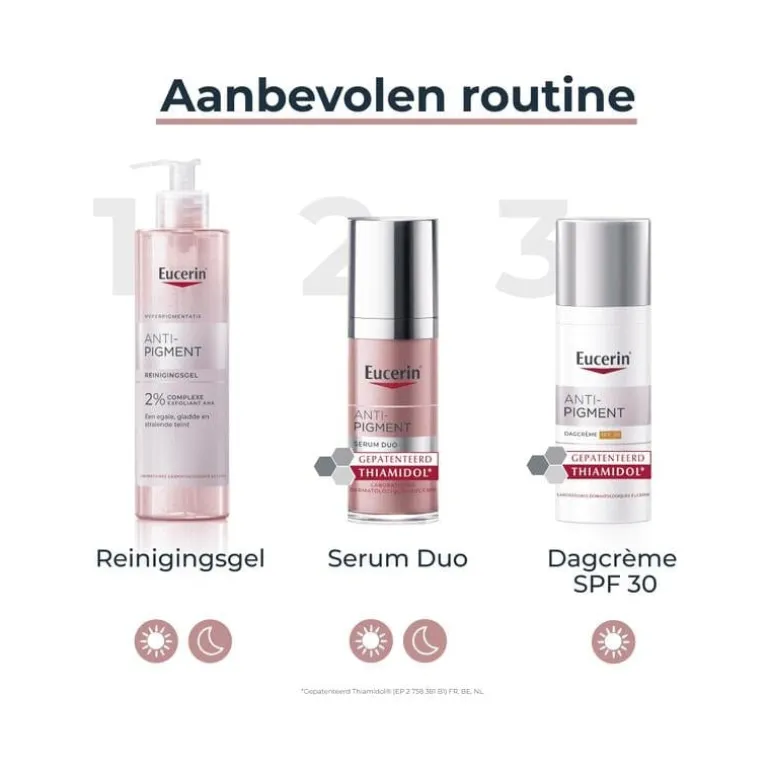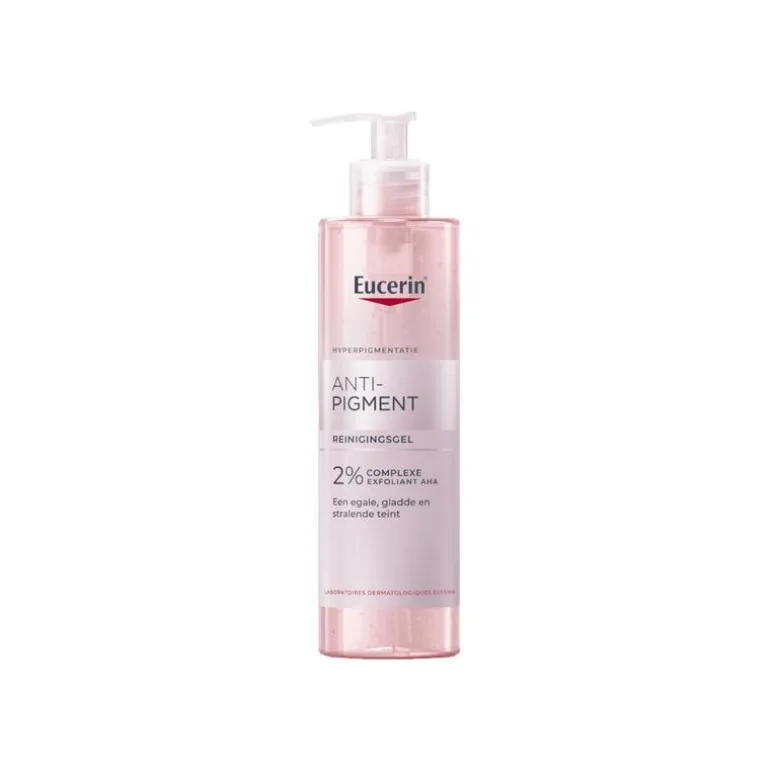Een complete dagelijkse Anti-Pigment routine. Dit is de Eucerin® Anti-Pigment Reinigingsgel, een essentiële stap bij uw huidverzorgingsroutine voor een optimale absorptie van uw verzorgingsproduct Anti-Pigment met Thiamidol®. Exfoliant met AHA, die de huid voorbereidt op de werking van Thiamidol®** om vanaf slechts één week donkere vlekken effectief te verminderen. Met een krachtig 2% AHA-complex verbetert deze reinigingsgel niet alleen direct het stralen van de huid, ook de onregelmatige teint wordt aangepakt en de gel helpt deze te corrigeren. Dankzij het ingrediënt gluco-glycerol helpt dit product de natuurlijke vochtbalans van de huid te behouden, waardoor uw huid onmiddellijk zacht aanvoelt.