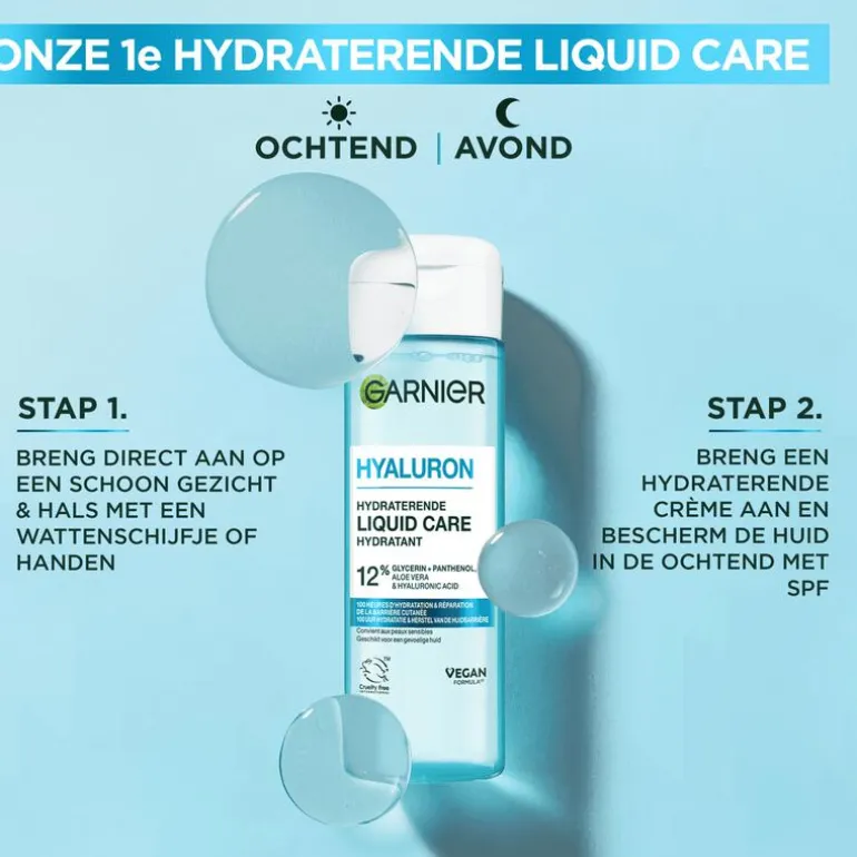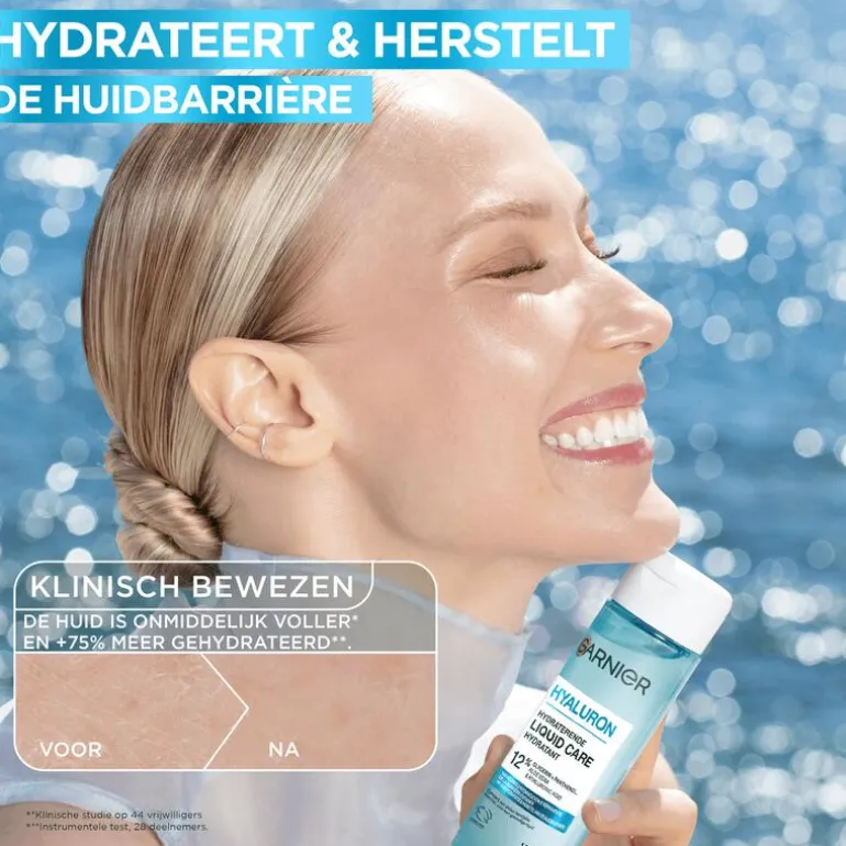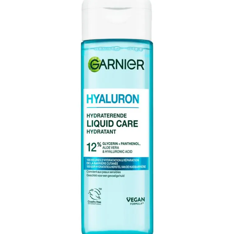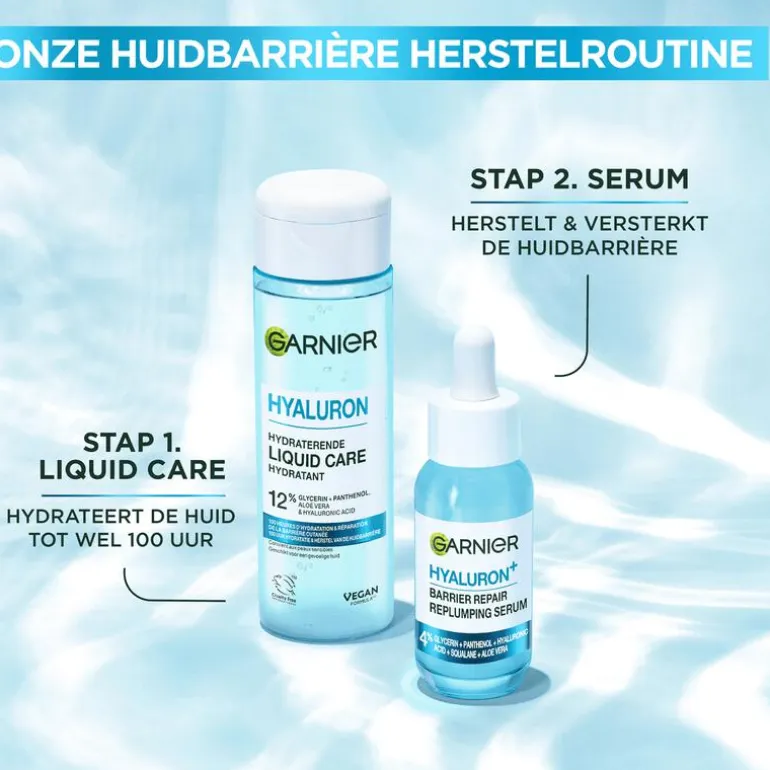 Garnier Hyaluron Barrier Repair Liquid Care is een intens hydraterende verzorging die 12% glycerine en panthenol combineert met aloë vera en hyaluronzuur om de huid 100 uur lang te hydrateren. Deze innovatieve ultralichte waterige formule is doeltreffend bij een droge huid om droogheid te verminderen en de huidbarrière te herstellen. Garnier Hyaluron Barrier Repair Liquid Care zorgt ervoor dat de huid er onmiddellijk voller* en +75% meer gehydrateerd** uitziet. De huidbarrière wordt sneller hersteld, terwijl de huid 100 uur lang gehydrateerd blijft. De lichte, transparante textuur van Garnier Hyaluron Barrier Repair Liquid Care kleeft niet en absorbeert snel – ideaal voor het aanbrengen van laagjes. De formule is dermatologisch getest en geschikt voor een gevoelige huid. Garnier zet zich al sinds 1989 in voor een wereld zonder dierproeven en voor groenere schoonheid. De vegan formule bevat geen dierlijke ingrediënten of bijproducten. De fles en dop zijn gemaakt van 100% gerecycled plastic***. *Klinische studie, 44 vrijwilligers **Instrumentele test, 28 proefpersonen ***Behalve etiketten, additieven en kleurstoffen