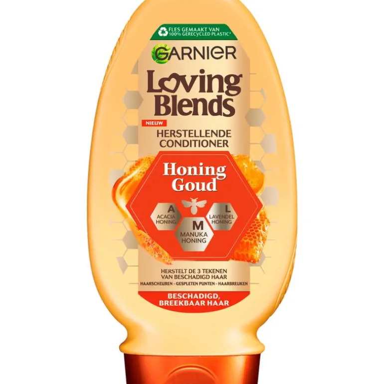 Garnier Loving Blends Honing Goud Conditioner is een herstellende conditioner van 97% natuurlijke oorsprong, speciaal ontwikkeld voor beschadigd en breekbaar haar.