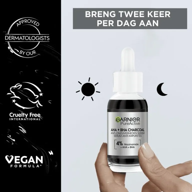 Garnier PureActive Anti-Onzuiverheden Serum met AHA + BHA & Charcoal is ons 1ste zwarte serum, geconcentreerd met 4% [NIACINAMIDE + AHA + BHA], vermindert puistjes en de zichtbaarheid van vlekjes en imperfecties. Het maakt de huid gladder en laat deze er egaler uitzien. AHA staat bekend om het exofoliëren van de doffe & oneffen huid, BHA helpt puisten & poriën te verminderen, en niacinamide staat bekend om een oncomfortabel gevoel bij puistjes te verzachten. Charcoal is een ingrediënt van natuurlijke oorsprong dat wel bekend is om haar zuiverende en matterende werking Ontdek ook de andere producten van Garnier PureActive voor een gladdere en gematteerde huid!