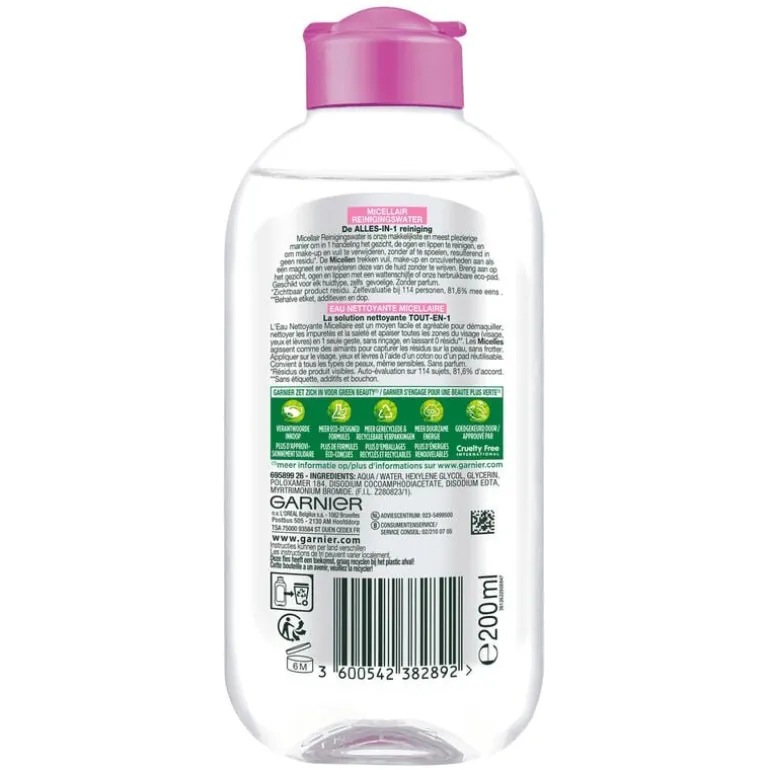Garnier Micellair reinigingswater is een oplossing met een zachte, geurloze formule en is geschikt voor alle huidtypes, ook voor de meest gevoelige huid. Het micellair water is verrijkt met micellen die afkomstig zijn uit de farmacie. Het zijn reinigende deeltjes die als een magneet onzuiverheden, make-up en talg op de huid aantrekken en zo van de huid verwijderen, zonder te wrijven.