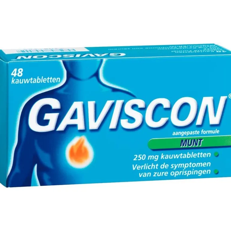 GAVISCON kauwtabletten zijn werkzaam bij brandend maagzuur en zure oprispingen.Dit geneesmiddel bevat aspartaan (E951), dat een bron van fenylalanine is. Mensen met fenylketonurie dienen hier rekening mee te houden.Voor gebruik de bijsluiter lezen.Raadpleeg uw arts wanneer de klachten na 7 dagen aanhouden.Bevat natrium en calcium. Als u een natirum- of calciumarm dieet volgt, raadpleeg dan uw arts voordat u dit product gebruikt.Dosering en wijze van gebruik Gebruik bij volwassenen (inclusief ouderen) en kinderen vanaf 12 jaar: als symptonen zich voordoen, neem dan twee totvier tabletten na de maaltijd en voor het naar bed gaan, tot maximaal vier keer per dagKinderen jonger dan 12 jaar: enkel geven op medisch advies.Voor orale toediening. Kauw goed op de tablettenvoordat u ze doorslikt.