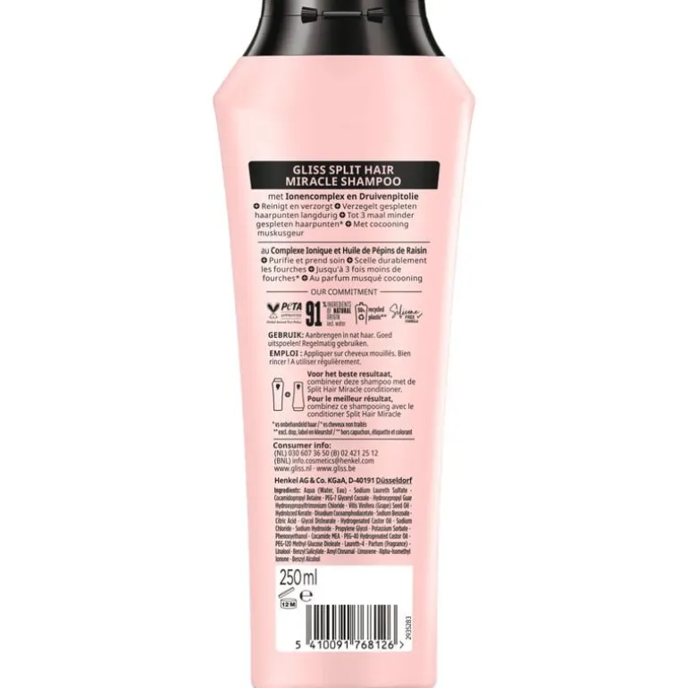 - Productvoordelen in één oogopslag: – De shampoo herstelt de beschadigde haarvezels en verzegelt langdurig gespleten haarpunten. – Tot 3 maal minder gespleten haarpunten – Reinigt en verzorgt – Met ionencomplex & druivenpitolie.- Deze ingrediënten egaliseren verschillen in de haarstructuur van de wortels tot in de haarpunten. – Gliss Care Level: 2 – Medium verzorging, met een uitgebalanceerde samenstelling van voedende ingrediënten. – De formule bevat 91% ingrediënten van natuurlijke oorsprong (incl. water)