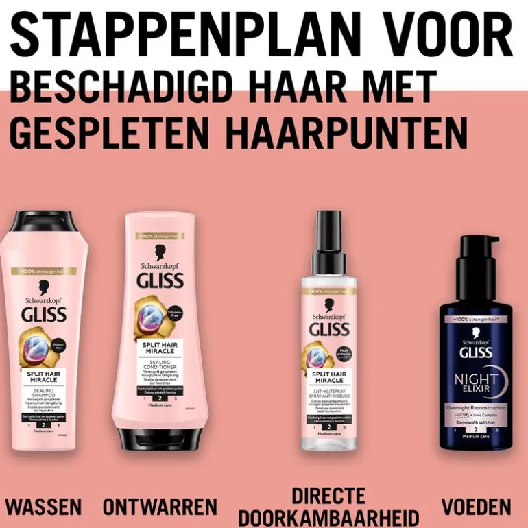 Haarverzorging is een wetenschap, geen geheim! Alle Gliss formules zijn speciaal afgestemd op iedere unieke haarbehoefte en zorgen voor zichtbare verbetering van de haarkwaliteit. De verzorgingsproducten van Gliss herstellen bestaande schade en voorkomen toekomstige schade door het versterken van de celstructuur en het bestrijden van vrije radicalen.Onze beste reparatie ooit: voorkom schade voordat het gebeurt, voor langdurig mooi haar. Gliss is een merk van Schwarzkopf.