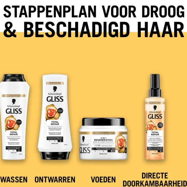 - Gliss Care Level: 3 – Intense verzorging, met diep herstellende formules met hoogwaardige ingrediënten.
