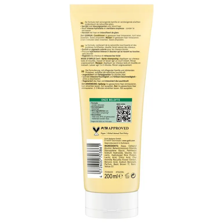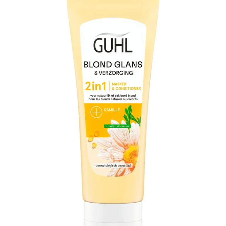 Guhl Blond Glans & Verzorging 2-in-1 Masker & Conditioner is speciaal ontwikkeld voor blond, gekleurd of gehighlight haar. Dankzij de speciale formule werken kleurpigmenten gericht op blond haar en intensiveren ze de natuurlijke levendigheid. De verzorgingsformule ondersteunt de regeneratie van de haarstructuur met een zachte textuur die het haar niet verzwaren. Het resultaat: intens stralend en soepel blond haar met een zijdezachte glans. Als conditioner voor onmiddellijke verzorging of als masker voor dieptereiniging – de formule, met verzorgende kamille en versterkende eiwitten, biedt intense hydratatie en versterkt het haar. De verzorging wordt afgerond met een frisse geur van sprankelende bergamot en witte bloemen. Voor een mooi glanzend blond bij elke toepassing!”