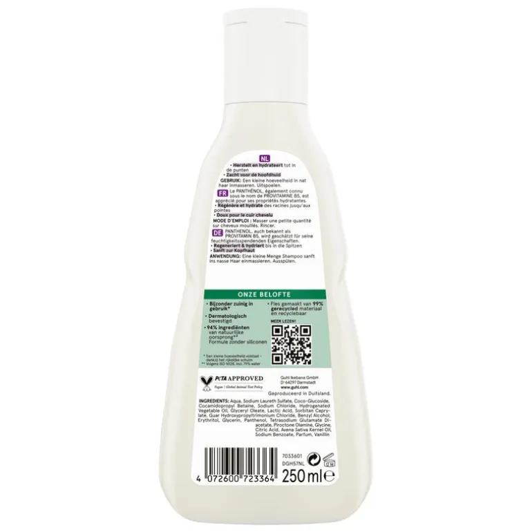 Guhl Panthenol + Reparatie Milde Shampoo is speciaal geschikt voor beschadigd haar. De zachte, maar effectieve formule, met Panthenol-verzorgingscomplex en havermelk, regenereert het haar, voorziet het van vocht en beschermt het tegen externe invloeden – voor gezond uitziend haar. De verzorgende shampoo is zacht voor de hoofdhuid en vrij van siliconen. Het verzorgt van de aanzet tot in de punten, zonder te verzwaren, en biedt het haar een zijdezachte soepelheid en natuurlijke glans. De romige textuur zorgt voor rijk schuim dat het haar zacht omhult en mild reinigt. Tegelijkertijd verwent het met een warme gourmand-geur van romige kokosmelk en een chocolade-nootachtige hartnoot, en transformeert elke wasbeurt in een geurige verzorgingservaring.