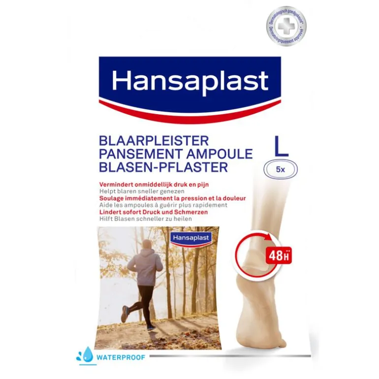 Hansaplast Blaarpleisters Groot (5 stuks) is een medisch hulpmiddel en een zeer effectieve behandeling voor grote blaren op de hielen. De pleister verlicht onmiddellijk de druk en pijn en biedt tegelijkertijd een veilige bescherming tegen vuil en bacteriën. Dankzij de extra sterke kleefkracht, die tot wel 48 uur meegaat, blijft de pleister stevig op zijn plaats, terwijl de hydrocolloid technologie bijdraagt aan een snellere genezing. De pleister heeft een formaat van 5,8 cm x 3,4 cm en is waterproof.