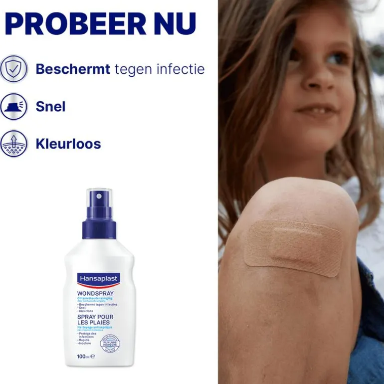 Hansaplast Wondspray (Reiniging). Zelfs oppervlakkige wonden kunnen geïnfecteerd raken als ze niet effectief worden gereinigd. Het reinigen van de wond is een essentiële eerste stap voor optimale genezing en wordt aanbevolen voor alle soorten wonden. Hansaplast Wondspray is een makkelijk te gebruiken spray voor de ontsmettende reiniging van kleine acute wonden zoals sneeën, schaafwonden, eerste en kleine tweede-graads brandwonden en open blaren. De spray kan ook worden gebruikt voor chronische wonden en postoperatieve wondzorg volgens de instructies van uw arts. De Hansaplast Wondspray helpt ook om korsten of stollingen te verwijderen. De spray is vrij van alcohol, prikt niet tijdens het aanbrengen en droogt de huid niet uit. Hansaplast Wondspray is een pijnvrij en effectieve manier om wonden te reinigen van vuil en bacteriën en voorkomt infecties van de wond. De oplossing is transparant, dus het zal niet vlekken op kleding zoals gekleurde producten met bijvoorbeeld jodium of eosine.