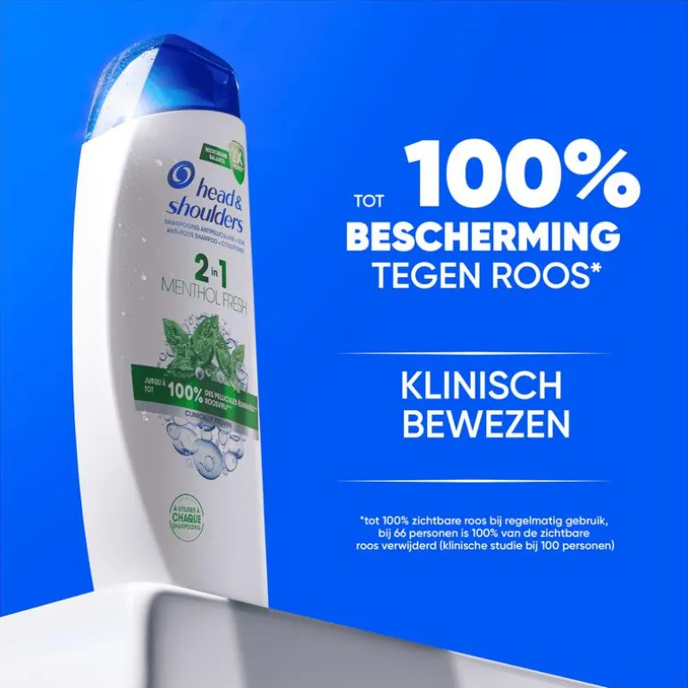 Head & Shoulders 2-in-1 Menthol Fresh Anti-roos shampoo voor elk haar- en hoofdhuidtype werkt zelfs tegen hardnekkige roos.