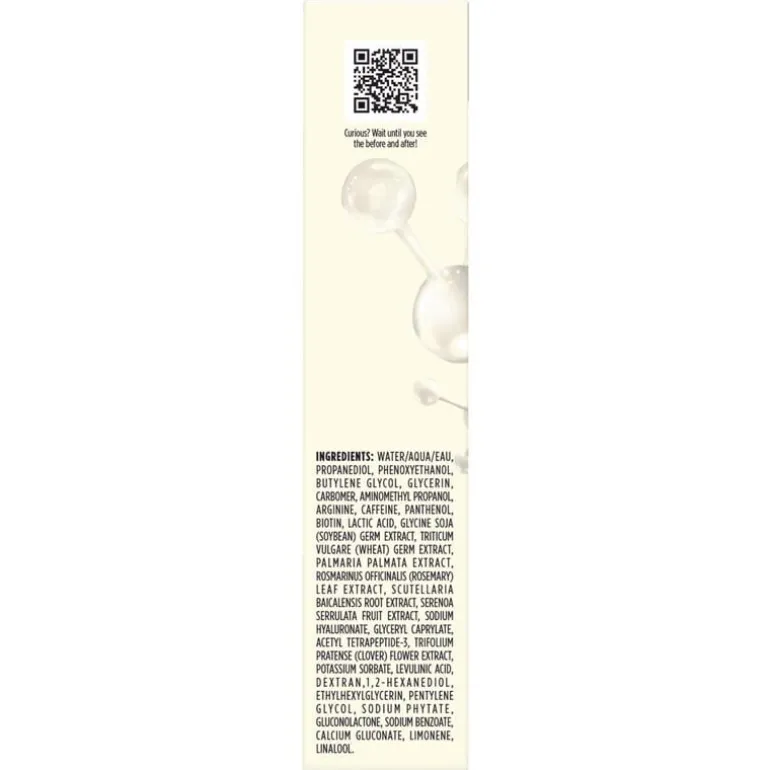 Water/Aqua/Eau, Propanediol, Phenoxyethanol, Butylene Glycol, Glycerin, Carbomer, Aminomethyl Propanol, Arginine, Caffeine, Panthenol, Biotin, Lactic Acid, Glycine Soja (Soybean) Germ Extract, Triticum Vulgare (Wheat) Germ Extract, Palmaria Palmata Extract, Rosmarinus Officinalis (Rosemary) Leaf Extract, Scutellaria Baicalensis Root Extract, Serenoa Serrulata Fruit Extract, Sodium Hyaluronate, Glyceryl Caprylate, Acetyl Tetrapeptide-3, Trifolium Pratense (Clover) Flower Extract, Potassium Sorbate, Levulinic Acid, Dextran,1,2-Hexanediol, Ethylhexylglycerin, Pentylene Glycol, Sodium Phytate, Gluconolactone, Sodium Benzoate, Calcium Gluconate, Limonene, Linalool