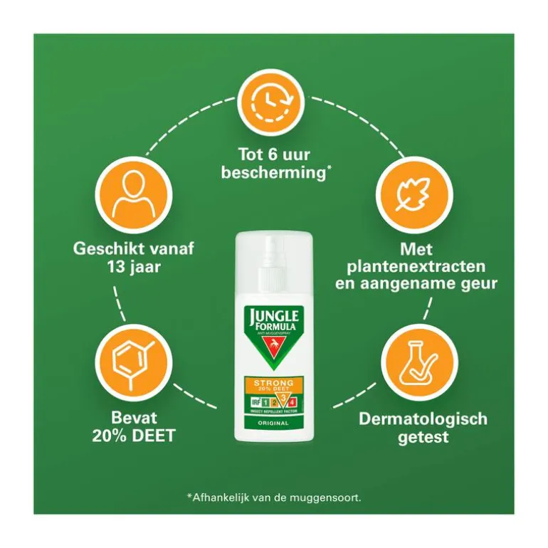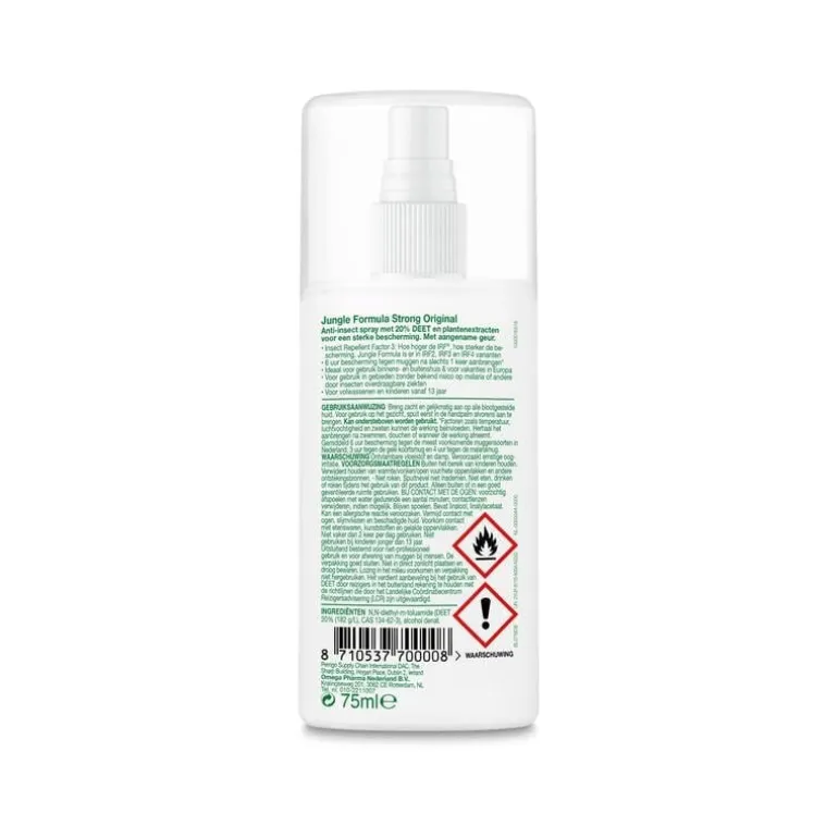 Jungle Formula Strong Original is een anti-insect spray met 20% DEET en plantenextracten voor een sterke bescherming. Deze muggenspray heeft een aangename geur en geeft wel 6 uur bescherming tegen muggen en andere stekende of bijtende insecten. Ideaal voor gebruik binnen- en buitenshuis & voor vakanties in Europa. Deze muggenbescherming is voor gebruik in gebieden zonder bekend risico op malaria of andere door insecten overdraagbare aandoeningen. Alle producten van Jungle Formula bevatten een IRF®. Hoe hoger de IRF®, hoe sterker de bescherming. Jungle Formula is er in IRF2, IRF3 en IRF4 varianten.