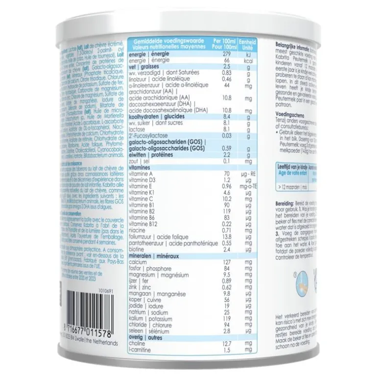 Ingrediënten: Lactose (MELK), Volle geitenMELK, Plantaardige oliën (1,3-Dioleoyl-2-palmitoyltriglyceride, Koolzaadolie, Zonnebloemolie), Geitenwei-eiwitconcentraat (MELK), Galacto-oligosachariden (MELK), Magere geitenMELK, Mineralen (Tricalciumfosfaat, Calciumcarbonaat, Natriumchloride, Kaliumchloride, Trinatriumcitraat, Kaliumhydroxide, IJzersulfaat, Trikaliumcitraat, Magnesiumchloride, Zinksulfaat, Kopersulfaat, Mangaansulfaat, Kaliumjodide, Natriumselenaat), Cholinebitartraat, 2′-Fucosyllactose (MELK), Olie van de microalgen Schizochytrium sp., Mortierella alpina-olie, Fructo-oligosachariden, Vitaminen (Natrium-L-ascorbaat, L-ascorbinezuur, DL-伪 tocoferylacetaat, Calcium D-pantothenaat, Niacinamide, Riboflavine, Thiaminehydrochloride, Pyridoxine hydrochloride, Retinylacetaat, Foliumzuur, Fytomenadion, D-biotine, Cholecalciferol, Cyanocobalamine), L-fenylalaline, Inositol, Taurine, L-tryptofaan, L-carnitine L-tartraat, Bifidobacterium animalis.