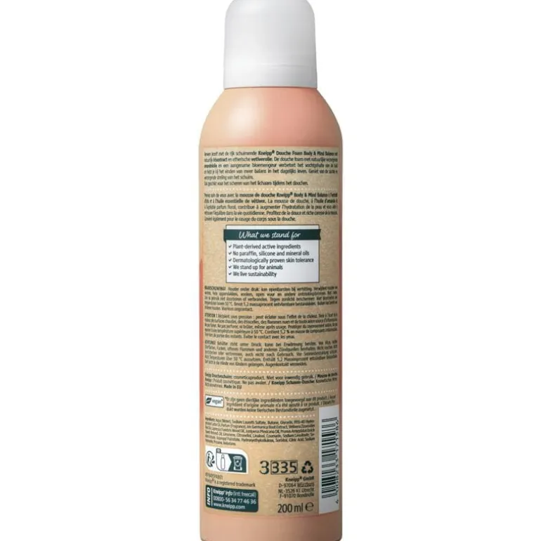 Verwen jezelf met de rijk schuimende Kneipp® Douche Foam Body & Mind Balance met natuurlijk irisextract en etherische vetiverolie. De douche foam met natuurlijke verzorgende amandelolie en een aangename bloemengeur verbetert het vochtgehalte van de huid en helpt je bij het vinden van meer balans in het dagelijks leven. Geniet van de zachte en verzorgende streling van het schuim. Ook geschikt voor het scheren van het lichaam tijdens het douchen.