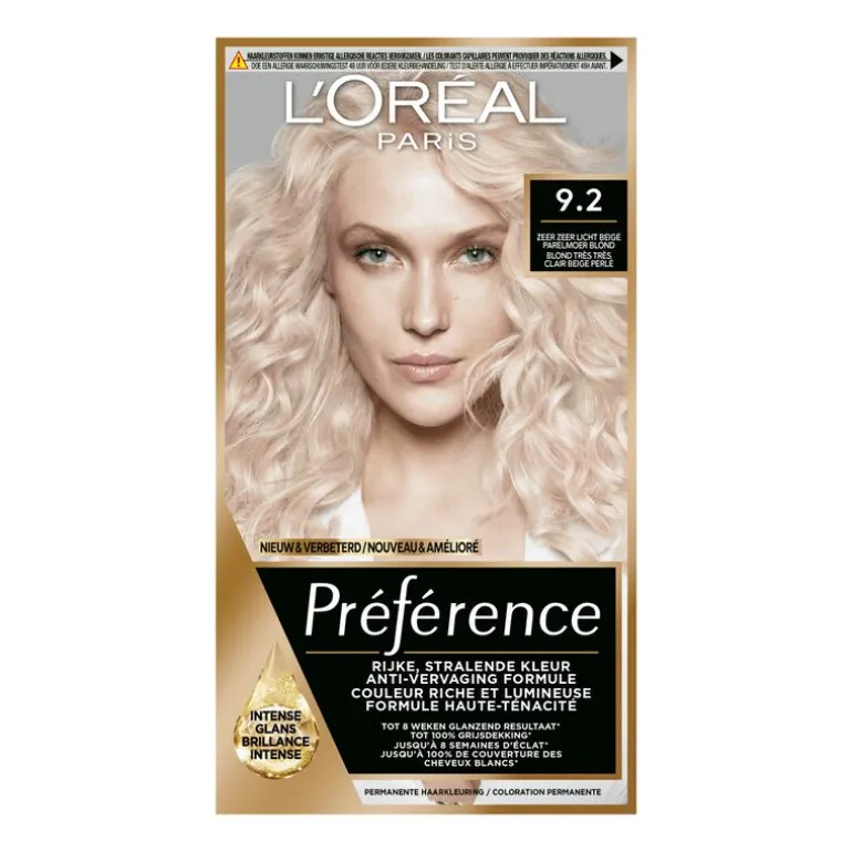 L’Oréal Paris Préférence is een permanente haarkleuring met tot 100% grijsdekking. De kleuring resulteert in een natuurlijke, stralende kleur met reflecties en langdurige glans. De verpakking bevat 5 componenten: kleurgel, ontwikkelcrème, glansbeschermende conditioner, handschoenen en gebruiksaanwijzing. De formule van Préférence bevat een UV-filter voor bescherming tegen zoninvloeden en Vitamine E ter ondersteuning van de haarkwaliteit. De glansbeschermende conditioner kan wekelijks worden gebruikt om de glans in het haar langer te behouden. Voorzorgsmaatregelen: Doe een allergie waarschuwingstest 48 uur vóór iedere haarkleurbehandeling ook indien je al eerder een kleurproduct hebt gebruikt. In de gebruiksaanwijzing in de verpakking staat beschreven hoe je dit doet. Volg tijdens het kleuren de gebruiksaanwijzing nauwkeurig op. Hoeveel verpakkingen heb ik nodig? Heb je kort haar of haar tot op je schouders? Dan is één verpakking voldoende. Bij halflang tot lang haar heb je twee verpakkingen nodig.Stap 1: Voorbereiding Voordat je begint: bedek je schouders met een handdoek en trek de bijgevoegde handschoenen aan.Giet de kleurgel in de aanbrengflacon met de ontwikkelcrème. Draai de aanbrengflacon dicht en schud krachtig totdat er een gelijkmatig mengsel ontstaat. Draai na het mengen onmiddellijk het uiterste topje van de aanbrengflacon af om ongewenst spatten van het product te voorkomen. Stap 2: Aanbrengen Optie 1: Op het gehele haar Deze optie is geschikt als je het haar nooit eerder hebt gekleurd, het haar 3 maanden of langer niet hebt gekleurd, of een donkerdere kleur wil proberen. Breng aan op het gehele haar. Gebruik de punt van de aanbrengflacon om de haren te scheiden in kleine, gelijke delen. Breng het kleurmengsel eerst aan op de haaraanzet en de hardnekkige grijze haren. Verdeel het mengsel vervolgens over de lengten en breng het aan over het gehele haar. Masseer het kleurmengsel zachtjes in totdat het volledig in het haar gedrongen is. Laat 25 minuten inwerken. Optie 2: Uitgroei bijwerken Deze optie is geschikt als het haar minder dan 3 maanden geleden in dezelfde of een vergelijkbare kleur gekleurd is. Breng aan op de haaraanzet. Gebruik de punt van de aanbrengflacon om de haren te scheiden in kleine, gelijke delen. Breng het kleurmengsel op de haaraanzet in. Masseer in en laat 20 minuten inwerken. Breng vervolgens het kleurmengsel aan op de lengten van het haar. Laat opnieuw 5 minuten inwerken. Stap 3: Spoelen Verdeel een beetje warm water over het haar en masseer het voorzichtig door. Spoel het haar grondig totdat het spoelwater helder is. Stap 4: Verzorging Breng de glans beschermende conditioner aan over het gehele haar en masseer zachtjes in. Laat 2 minuten inwerken en spoel grondig uit. Gebruik 1 keer per week. L’Oréal Paris Préférence is een permanente haarkleuring die tot 100% grijsdekking biedt. In de verpakking van Préférence vind je 5 componenten: de kleurgel, de ontwikkelcrème, de glansbeschermende conditioner en natuurlijk een paar handschoenen en de gebruiksaanwijzing. De kleurgel meng je met de ontwikkelcrème. De Préférence glansbeschermende conditioner kan na de kleurbehandeling meerdere malen gebruikt worden. De conditioner bevat een UV-filter om het gekleurde haar tegen de invloeden van de zon te beschermen en Vitamine E, ter ondersteuning van de haarkwaliteit. Bij wekelijks gebruik van de conditioner zal de glans in het haar langer behouden blijven.