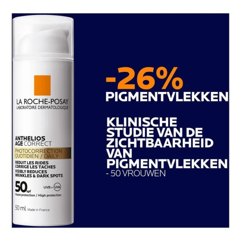 Anthelios Age Correct SPF50 zonbescherming is een zonnecrème tegen rimpels en donkere vlekjes voor het gezicht met een zeer hoge SPF 50 UVA/UVB-bescherming. De crème helpt de tekenen van huidveroudering in 4 weken verkomen en verminderen door fijne lijntjes en rimpels op te vullen en de fysiologische mechanismen van huidvernieuwing te stimuleren. De zonnecrème biedt ook bescherming tegen vervuiling (door de aanhechting van vervuilende deeltjes op de huid te beperken) en bescherming tegen oxidatie (door oxidatieve stress veroorzaakt door vervuiling en infrarood te voorkomen).
