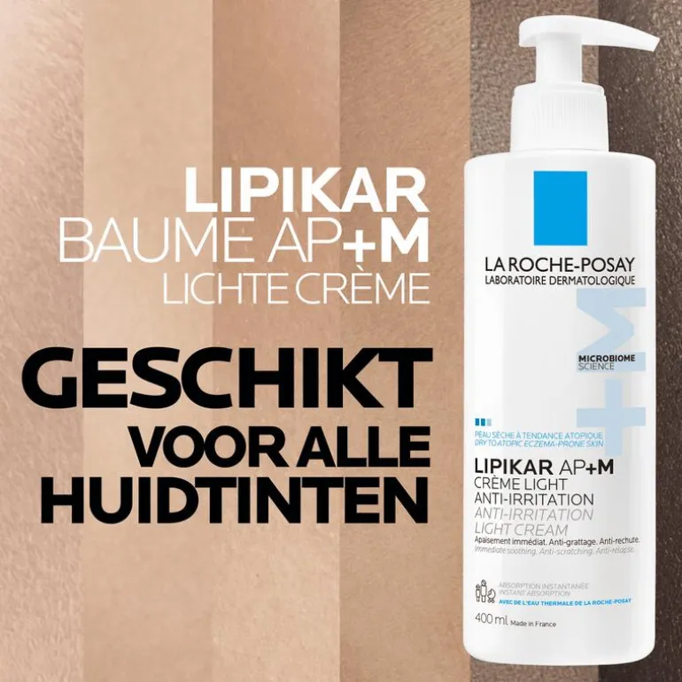 La Roche-Posay Lipikar Baume AP+M Lichte Crème is een geavanceerde, lichte crème speciaal ontworpen voor een droge, jeukende huid met neiging tot atopisch eczeem. De innovatieve formule verzacht de huid onmiddellijk en vermindert jeuk en het gevoel van irritatie door droogheid. Dankzij de unieke AP+M Technologie en Niacinamide wordt het microbioom van de huid ondersteund, waardoor ernstige droogheid minder vaak voorkomt en het helpt de huidbarrière herstellen. La Roche-Posay Lipikar Baume AP+M Lichte Crème ondersteunt en beschermt de huidbarrière door jeuk, irritatie en uitdroging van de huid tegen te gaan. Verrijkt met 5% Sheaboter, voedt het de huid diepgaand en herstelt het de huidbarrière. De niet-plakkerige textuur voelt soepel aan en trekt snel in, wat dagelijks gebruik vergemakkelijkt. Het product is geschikt voor alle huidtypen, van baby’s tot volwassenen, inclusief de meest gevoelige huid en huid met neiging tot allergische reacties, en zelfs voor patiënten die een kankerbehandeling ondergaan. Regelmatig gebruik vermindert jeuk, verbetert de levenskwaliteit en vermindert slaapstoornissen veroorzaakt door jeuk. De fles is bovendien gemaakt van 100% gerecycled plastic met uitzondering van de pomp, kleurstoffen en additieven.
