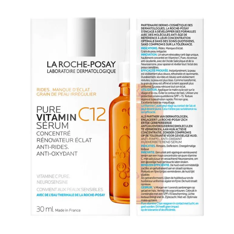 La Roche-Posay Pure Vitamin C12 Serum is een anti-aging gezichtsserum dat de natuurlijke huidvernieuwing ondersteunt verrijkt met 12% geconcentreerde vitamine C, salicylzuur en neurosensine. Deze gezichts- en halsverzorging kalmeert en verbetert de huid door rimpels, een doffe teint en een onregelmatige huidtextuur aan te pakken. De huid voelt onmiddellijk zachter en gehydrateerd aan. Het serum is geschikt voor alle huidtypes, in het bijzonder een gevoelige huid om deze opnieuw te laten stralen. De vederlichte, rijke textuur dringt snel in de huid en zorgt voor een niet-plakkerige, niet-vette finish. Het product is ook ideaal als make-up basis.