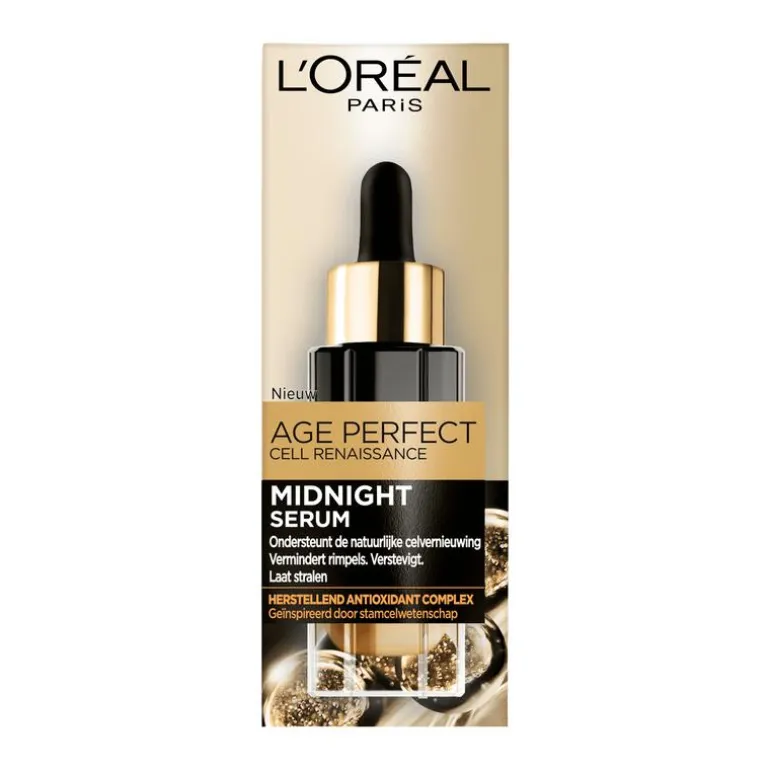L’Oréal Paris Age Perfect Cell Renaissance Midnight Serum – Gezichtsverzorging – Anti-Rimpel – 30 ml Een anti-aging gezichtsserum met herstellend antioxidant complex om rimpels zichtbaar te verminderen Productbeschrijving Het L’Oréal Paris Age Perfect Cell Renaissance midnight serum bevat een herstellend antioxidant complex met vitamine E. Ondersteunt de natuurlijke celvernieuwing Vermindert zichtbaar rimpels, verstevigt en laat de huid stralen Helpt de huid herstellen, nacht na nacht Voor een gladdere en stevigere huid Herstellend antioxidant complex met neohesperidine en vitamine E Als tekenen van ouderdom zichtbaar worden, zoals rimpels in de huid, is een dagelijkse verzorging van de huid erg belangrijk. L’Oréal Paris Age Perfect Cell Renaissance midnight serum bevat een herstellend antioxidant complex met neohesperidine en vitamine E. Neohesperidine is een ingrediënt dat bijdraagt aan de hydratering, egalisering en het kalmeren van de huid. Het resultaat De volgende ochtend: de huid voelt gehydrateerd aan en ziet er uitgerust uit, zoals na een goede nachtrust Na 1 week: de huid ziet er jonger, stralender en als nieuw uit Na 4 weken: rimpels zijn zichtbaar verminderd en de teint is stralender en de huid ziet er strakker uit.