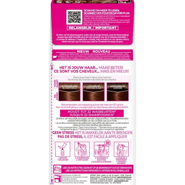 Voorzorgsmaatregelen: Doe een allergie waarschuwingstest 48 uur vóór iedere haarkleurbehandeling ook indien je al eerder een kleurproduct hebt gebruikt. In de gebruiksaanwijzing in de verpakking staat beschreven hoe je dit doet. Volg tijdens het kleuren de gebruiksaanwijzing nauwkeurig op. Hoeveel verpakkingen heb ik nodig? Heb je kort haar of haar tot op je schouders? Dan is één verpakking voldoende. Bij halflang tot lang haar heb je twee verpakkingen nodig.Stap 1: Voorbereiden Voordat je begint: kam je haar en bedek je schouders met een oude handdoek. Verwijder de dop van de tube kleurcrème. Verwijder de grijze ring. Schroef de dop terug op de tube om te openen. Verwijder de dop van de flacon ontwikkelcrème. De dop van de kleurcrème tube is al geopend bij het doen van de allergie waarschuwingstest. Voeg vervolgens de gehele inhoud van de tube kleurcrème toe aan de aanbrengflacon met de ontwikkelcrème. Sluit zorgvuldig de aanbrengflacon gevuld met ontwikkelcrème. Schud krachtig om een perfect egaal kleurmengsel te krijgen. Draai na het mengen onmiddellijk het uiterste topje van de aanbrengflacon af om ongewenst spatten te vermijden, omdat er druk op staat. Stap 2: Aanbrengen Optie 1: Op natuurlijk haar Voor natuurlijk haar of haar dat meer dan 3 maanden geleden gekleurd is. Breng het kleurmengsel lok voor lok op het haar aan op het gehele haar. Maak scheidingen met de punt van de aanbrengflacon. Verdeel de rest van het kleurmengsel over de lengtes en de punten van het haar. Zorg ervoor al het kleurmengsel te gebruiken. Masseer om ervoor te zorgen dat het product grondig inwerkt op het haar en goed verdeeld is. Laat 20 minuten inwerken. Optie 2: Op gekleurd haar Voor haar dat minder dan 3 maanden gekleurd is. Breng het kleurmengsel lok voor lok op de haaraanzet aan. Maak scheidingen met de punt van de aanbrengflacon. Masseer de haaraanzet goed zodat het kleurmengsel goed wordt verdeeld. Laat 15 minuten inwerken op de haaraanzet. Verdeel vervolgens de rest van het kleurmengsel over de lengtes en de punten van het haar. Zorg ervoor al het kleurmengsel te gebruiken. Masseer om ervoor te zorgen dat het product grondig inwerkt op het haar en goed verdeeld is. Laat het product nog 5 minuten inwerken. Stap 3: Spoelen Breng een beetje lauw water aan op het haar en masseer in. Spoel het haar overvloedig met lauw water totdat het spoelwater helder is. Stap 4: Verzorging Breng een royale hoeveelheid van de conditioner aan op het haar. Laat het 2 minuten inwerken. Spoel grondig uit met lauw water. Bewaar de restanten van de conditioner. Dit kan hergebruikt worden om na het wassen van het haar de glans te versterken.