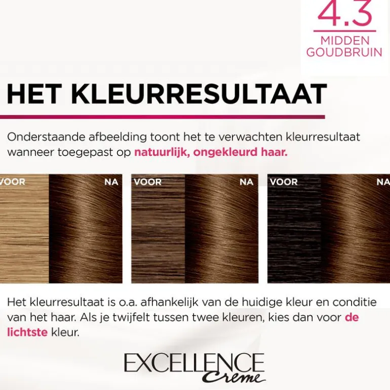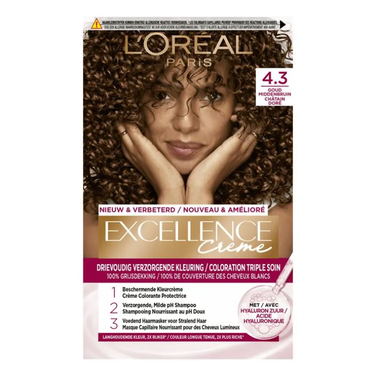 L’Oréal Paris Excellence Crème is een permanente haarkleuring met tot 100% grijsdekking, en een rijke en levendige kleur. De nieuwe en verbeterde formule verrijkt met hyaluronzuur zorgt voor een langhoudende kleur die 2x rijker* oogt. Het drievoudig verzorgende systeem bevat een beschermende crèmekleuring, een zachte pH shampoo voor de hoofdhuid, en een voedend haarmasker die zorgen voor glanzend, soepel en levendig haar. Verrijkt met pro-keratine, hyaluronzuur en een ingebouwd serum, versterkt de formule het haar en biedt bescherming tijdens het kleuren.