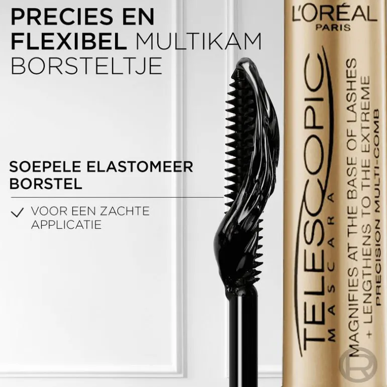 L’Oréal Paris Telescopic Mascara biedt tot 60%* langere wimpers en perfecte separatie. Transformeer je wimpers met deze mascara dankzij de innovatieve formule en het unieke borsteltje. Het precieze en flexibele multikam borsteltje met 4 platte zijkanten en kammetjes aan elke rand separeert de wimpers van elkaar en zorgt dat zelfs de kleinste wimpers worden verlengd, van wortel tot punt. De formule bevat telescopische microvezels waarmee je gemakkelijk je wimpers meer lengte geeft. Ervaar een moeiteloze applicatie zonder klontjes, voor een gedefinieerde en open blik. De L’Oréal Paris Telescopic Mascara blijft de hele dag perfect zitten, zodat je geen omkijken hebt naar je mascara. Geniet van extreme lengte en wimpers die perfect van elkaar gescheiden zijn. Bovendien is de formule geschikt voor gevoelige ogen en contactlensdragers. (*Instrumentele test)