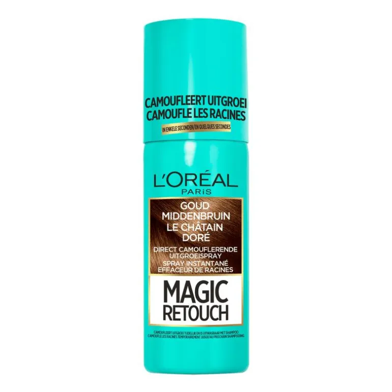 L’Oréal Paris Magic Retouch is een uitwasbare, camouflerende uitgroeispray die jouw uitgroei in 3 seconden laat verdwijnen. De uitgroeispray camoufleert uitgroei tot de eerstvolgende wasbeurt met shampoo. Wanneer je jouw haar kleurt, wordt uitgroei tussen de kleurbeurten door zichtbaar. Magic Retouch uitgroeispray is ontwikkeld om deze uitgroei te camoufleren. Magic Retouch zit in een spuitbus, waardoor je met het handige spraysysteem de formule snel en eenvoudig aanbrengt. De spray mengt zich met de haarkleur van het gekleurde haar, waardoor kleurverschil tot een minimum wordt beperkt en het resultaat natuurlijk oogt. De uitgroeispray dekt uitgroei volledig en is ideaal voor het camoufleren van grijs haar. De formule droogt snel en blijft de hele dag goed zitten. Met behulp van shampoo is de uitgroeispray direct uitwasbaar. Magic Retouch uitgroeispray is beschikbaar in verschillende kleuren. Kies de kleur die zo dicht mogelijk bij de kleur van jouw gekleurde haar ligt voor een zo natuurlijk mogelijk resultaat.