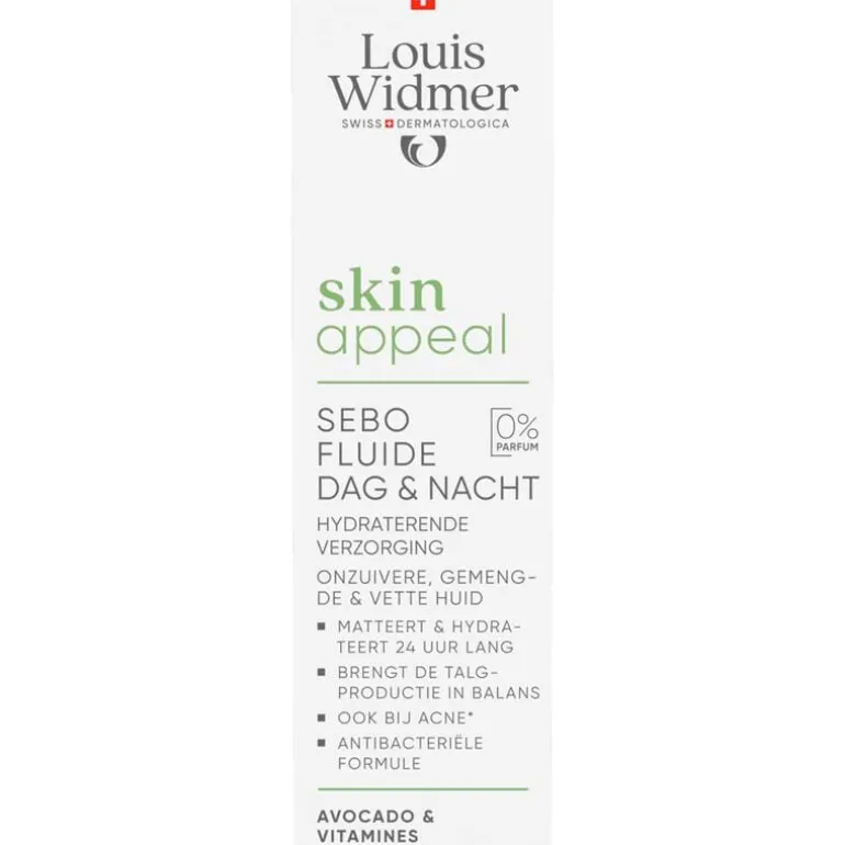 Louis Widmer skinappeal Sebo Fluide Dag & Nacht is een matterende dag- en nachtverzorging.