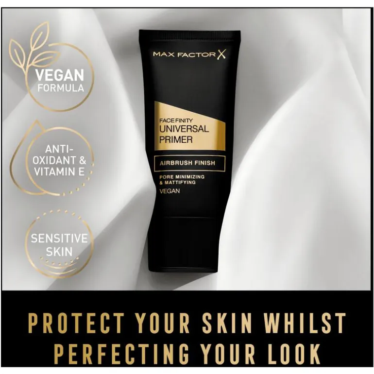 Maak kennis met de Max Factor Facefinity Universal Primer, een primer die de huid beschermt en de teint perfectioneert. Deze matterende, langhoudende make-upprimer verfijnt poriën en biedt een perfect egale finish. De vederlichte, zijdeachtige poedertextuur vervaagt en egaliseert oneffenheden en versmelt moeiteloos met de huid, die bovendien heerlijk gehydrateerd blijft. De Max Factor primer heeft een vegan formule die verrijkt is met antioxidanten en vitamine E om de huid optimaal te beschermen. Een porievervagende primer die ervoor zorgt dat make-up langer blijft zitten, voor een feilloze en langhoudende look.