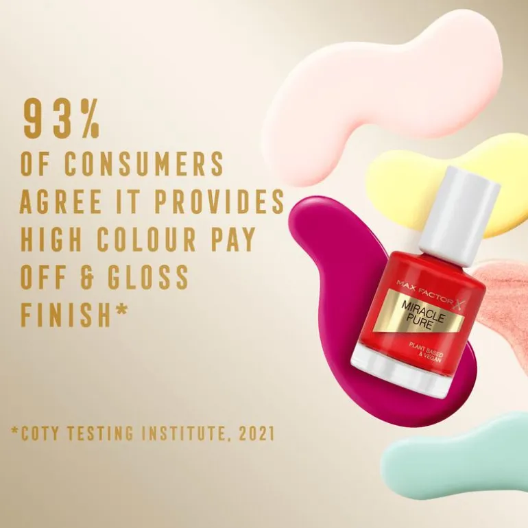 Verzorgend tijdens het dragen…Max Factor introduceert Miracle Pure Nagellak – onze eerste 100% vegan nagellak mede mogelijk gemaakt door plantaardige ingrediënten; Met rijke kleuren en een hoge glans die lang aanhoudt.