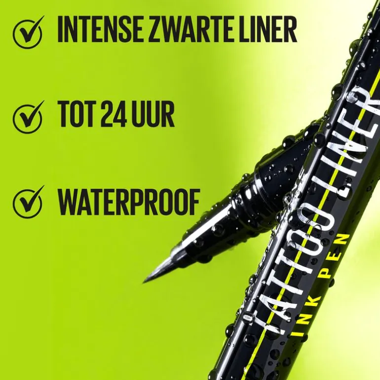 De Tattoo Studio Ink Pen Eyeliner van Maybelline New York weerstaat alles. Deze vloeibare eyeliner is waterproof, geeft niet af en vervaagt niet. Intense zwarte eyeliner houdt tot 24 uur. Onze zwartste pigmenten voor een intens tattoo effect. Vegan formule: geen dierlijke ingrediënten.