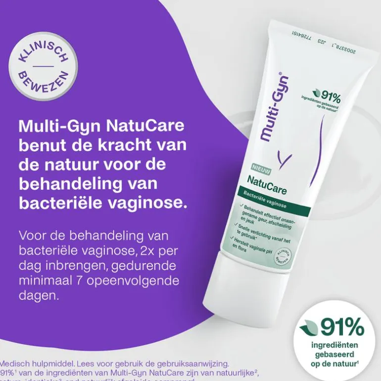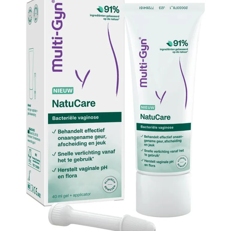 Last van symptomen van bacteriële vaginose [BV]? De nieuwe Multi-Gyn NatuCare maakt gebruik van de kracht van de natuur en is zacht voor je lichaam en sterk tegen BV – de werkzaamheid is klinisch bewezen. Multi-Gyn NatuCare behandelt BV en de symptomen ervan effectief: irritatie, afscheiding, jeuk en geur. Het bevat 91% natuurlijke ingrediënten.