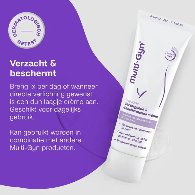 “Multi-Gyn Verzorgende & Beschermende Crème kalmeert, verlicht en beschermt geïrriteerde, droge en jeukende huid in de uitwendige intieme zone, veroorzaakt door scheren/waxen, kleding, transpiratie of zeep. Het 2QR-complex ondersteunt de natuurlijke huidbarrière van de intieme huid, en verlicht direct de geïrriteerde huid.