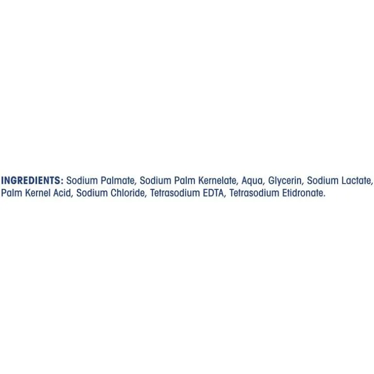Ingrediënten: Sodium palmate, sodium palm kernelate, aqua, glycerin, sodium lactate, palm kernel acid, sodium chloride, tetrasodium EDTA, tetrasodium etidronate.