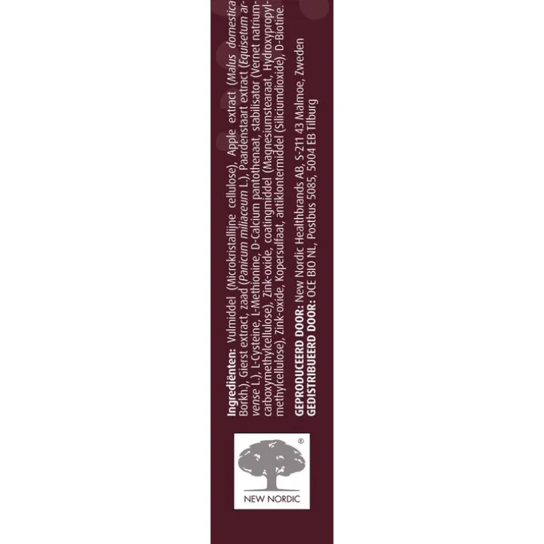 Vulmiddel (Microkristallijne cellulose), Apple extract (Malus domesticaBorkh.), Gierst extract, zaad (Panicum miliaceum L.), Paardenstaart extract (Equisetum arvense L.), L-Cysteine, L-Methionine, D-Calcium pantothenaat, stabilisator (Vernet natriumcarboxymethylcellulose), Zink-oxide, coatingmiddel (Magnesiumstearaat, Hydroxypropylmethylcellulose), Zink-oxide, Kopersulfaat, antiklontermiddel (Siliciumdioxide), D-Biotine.