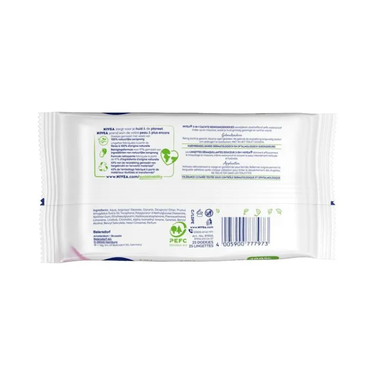 NIVEA 3in1 Zachte Reinigingsdoekjes (25 stuks) verwijderen effectief zelfs waterproof make-up en mascara, terwijl ze de huid met zorg reinigen. Deze doekjes zijn speciaal ontwikkeld om de huid te hydrateren en te verfrissen, zodat je huid zacht en verzorgd aanvoelt. Ze zijn gemaakt van 100% plantaardige vezels en dermatologisch en oftalmologisch goedgekeurd, waardoor ze geschikt zijn voor de gevoelige huid. De formule bevat het SkinGentle Complex met Pro-Vitamine B5 en Hydramine, wat helpt de vochtbalans te beschermen en een droog huidgevoel voorkomt. Deze doekjes bieden een milde reiniging en zorgen voor een frisse, gehydrateerde huid zonder irritaties.