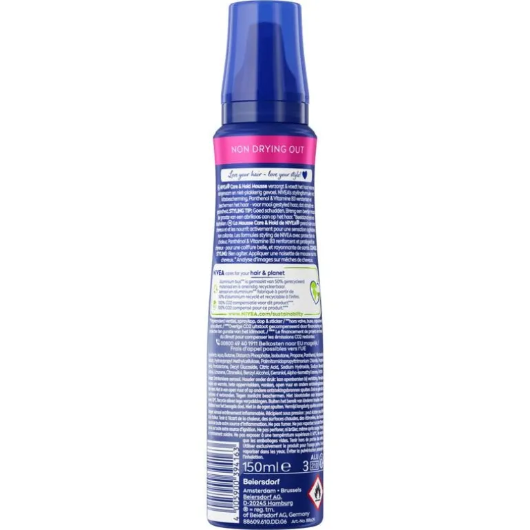 NIVEA Care & Hold Styling Mousse geeft je haar 24 uur lang betrouwbare fixatie en voedt het intensief, zonder dat het plakkerig aanvoelt. Deze mousse helpt de haarstructuur te regenereren en te versterken, wat zorgt voor gezond en stevig haar. Verrijkt met Panthenol en Vitamine B3, biedt het ook bescherming tegen hitte, ideaal voor dagelijks stylen met föhn of krultang. De mousse droogt het haar niet uit en laat het soepel en glanzend achter, zonder dat het zwaar aanvoelt. Geschikt voor iedereen die op zoek is naar langdurige stylingcontrole en verzorging in één. NIVEA Care & Hold Styling Mousse biedt jouw haar een gezonde, verzorgde look en langdurige fixatie, ideaal voor een natuurlijke, stralende uitstraling.