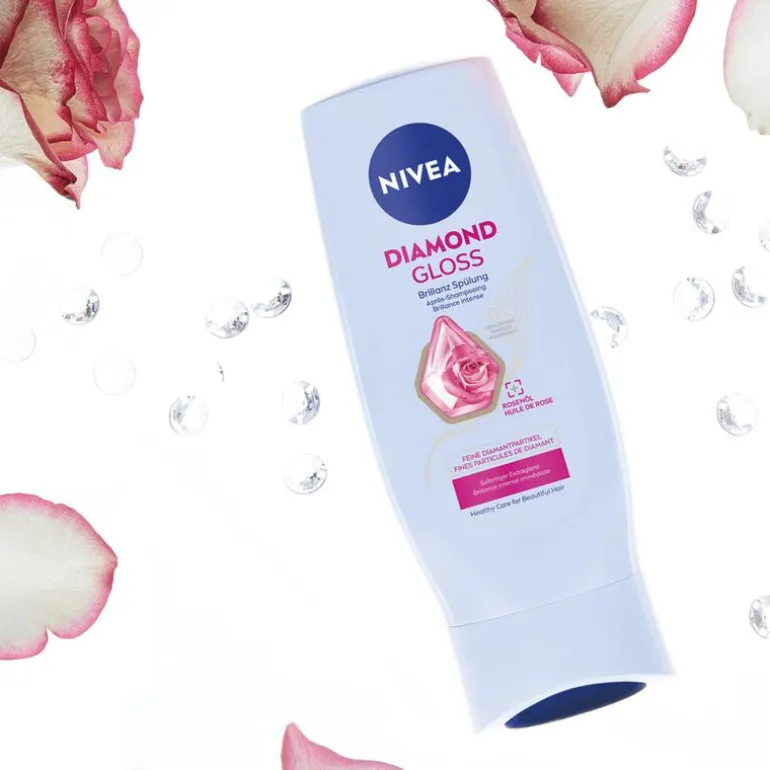 Diamanten glans en intensieve verzorging: NIVEA Diamond Gloss Conditioner verzorgt intensief voor voelbaar soepel en zacht haar. De formule verstevigt het haar voor meer glans, beschermt diezelfde glans en verbetert de doorkambaarheid. NIVEA Diamond Gloss Haarconditioner laat lang dof haar weer glanzen. Weerspiegelt het licht dat op je haar valt en maakt lang haar glad en soepel. De formule verrijkt met rozenolie zorgt voor mooi en zichtbaar glans effect.