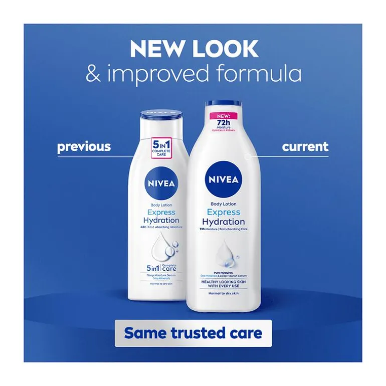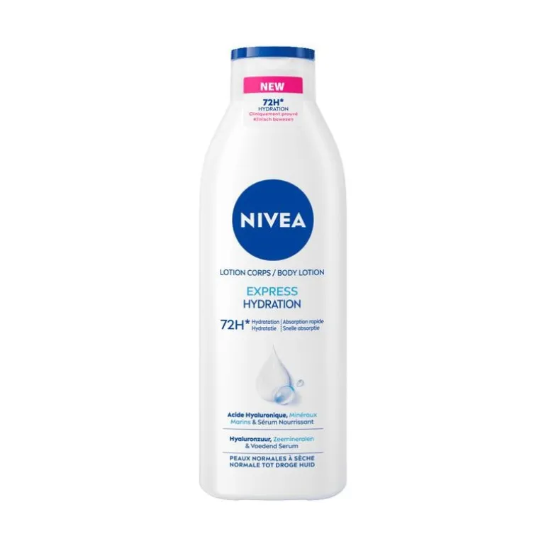De nieuwe, verbeterde formule van de NIVEA Express Body Lotion hydrateert de huid voor 72uur* lang (klinisch bewezen) voor een gezond uitziende huid bij elk gebruik. Zeer lichte formule met puur hyaluronzuur, zeemineralen en voendend serum. Deze bodymilk biedt verzorging, is niet vettig en trekt snel in. Perfect voor de normale tot droge huid. Ervaar langdurige verzorging en een huid die soepel aanvoelt, de hele dag door. Geef je huid de aandacht die ze verdient met de NIVEA Express Body Lotion. Ideaal voor dagelijks gebruik om je huid verzorgd te houden. Ontdek het gevoel van een goed gehydrateerde huid.